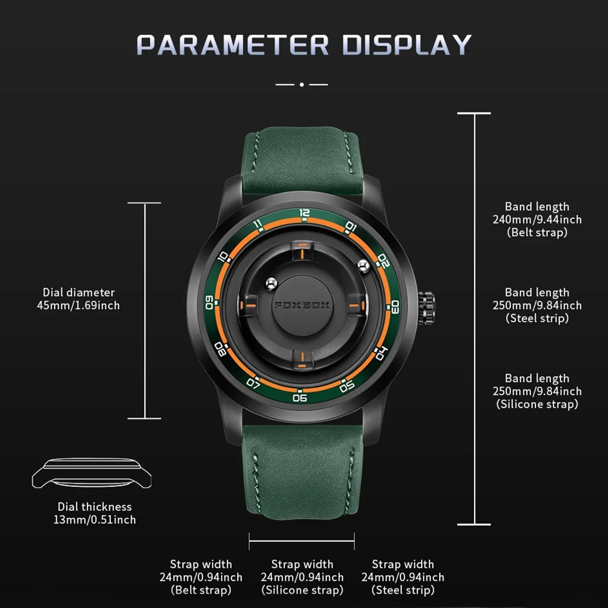 Elevate Your Style with the FOXBOX Fashion Men's Business Watch – A Perfect Blend of Elegance and Durability In the world of fashion and functionality, a watch is more than just a timekeeping device—it's a statement. The FOXBOX Fashion Men's Business Watch is designed to make that statement with a perfect balance of sophistication, durability, and modern design. Whether you're heading to a business meeting, a casual outing, or a rugged adventure, this watch is your ultimate companion. With its magnetic steel ball dial, waterproof construction, and sporty-military aesthetic, it's more than just a timepiece—it's a lifestyle accessory. Sleek Design for the Modern Gentleman The FOXBOX Fashion Men's Business Watch is crafted for men who appreciate both style and substance. Its sleek, minimalist design features a polished stainless steel case that exudes a timeless elegance. The watch face is protected by a scratch-resistant mineral glass, ensuring it stays looking pristine no matter how often you wear it. The magnetic steel ball dial is not only a unique design element but also a subtle nod to the watch's advanced engineering and attention to detail. This watch is ideal for men who want to make a strong impression without being over the top. The clean lines and refined aesthetics make it suitable for both formal and casual settings. Whether you're dressing up for a business meeting or keeping it casual for a weekend brunch, the FOXBOX Fashion Men's Business Watch complements your look effortlessly.
